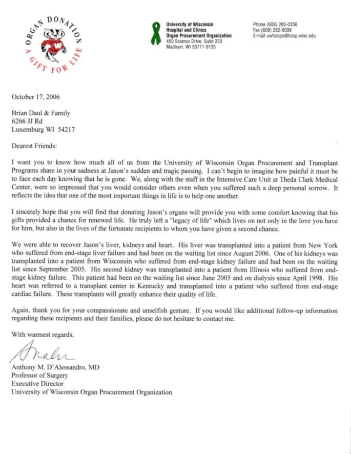The letter from the UW Organ Procurement Organization detailing how Jason was able to help others.